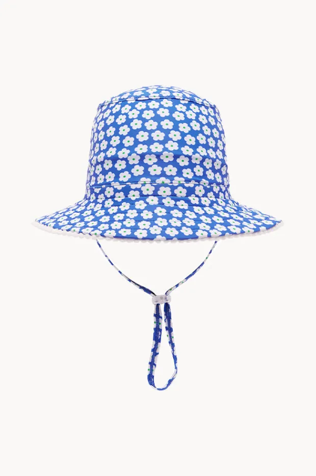 Babes In The Shade Girls Blue Daisy Sunhat in Blue/White features a wide brim for sun protection, chlorine resistant, chin strap, and is available in sizes S-M.
