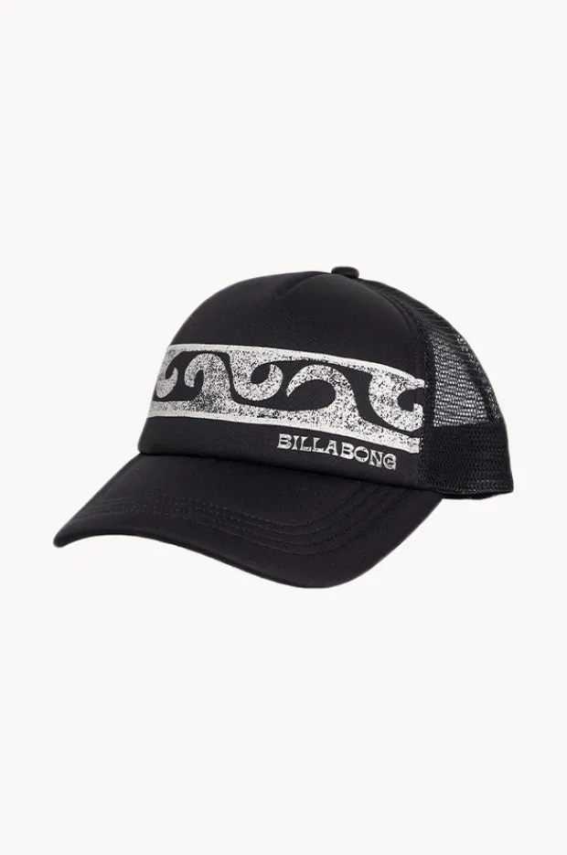 Billabong Girls Wave Fade Trucker Cap in Off Black features a curved peak, breathable mesh panelling, adjustable back, and is available in O/S.