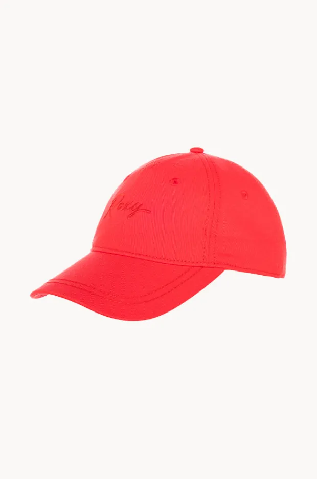 Roxy Dear Believer Colour Cap in Tomato features a baseball style hat, curved peak, embroidered logo and eyelets, adjustable back, and is available in One Size.