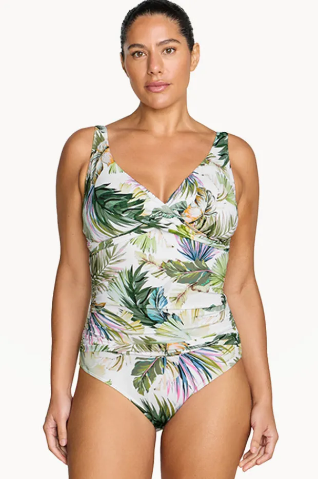 Artesands Lushara Delacroix One Piece in White features a cross front neckline, soft cups, adjustable straps, powermesh, and is best suited to D-G cup sizes.