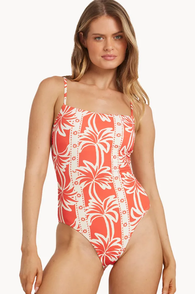 Billabong Row of Palms Bella One Piece in Red offers a square neckline, removable cups, adjustable straps, cheeky coverage, and is best suited to A-C cup sizes.