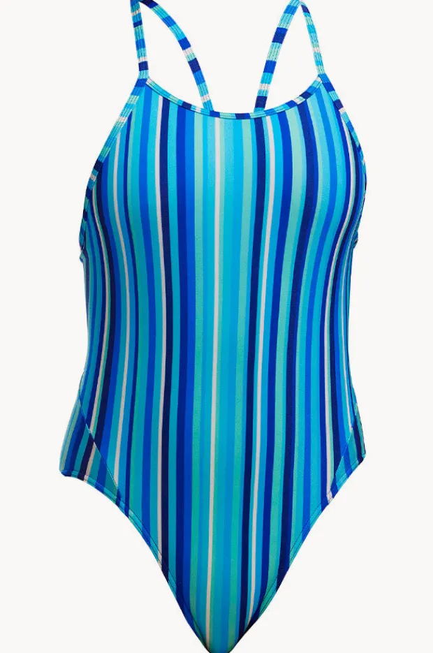 The Funkita Girls Lane Lines Diamond Back One Piece in Blue offers single bind straps, quick drying and chlorine resistant, available in sizes 8-14.