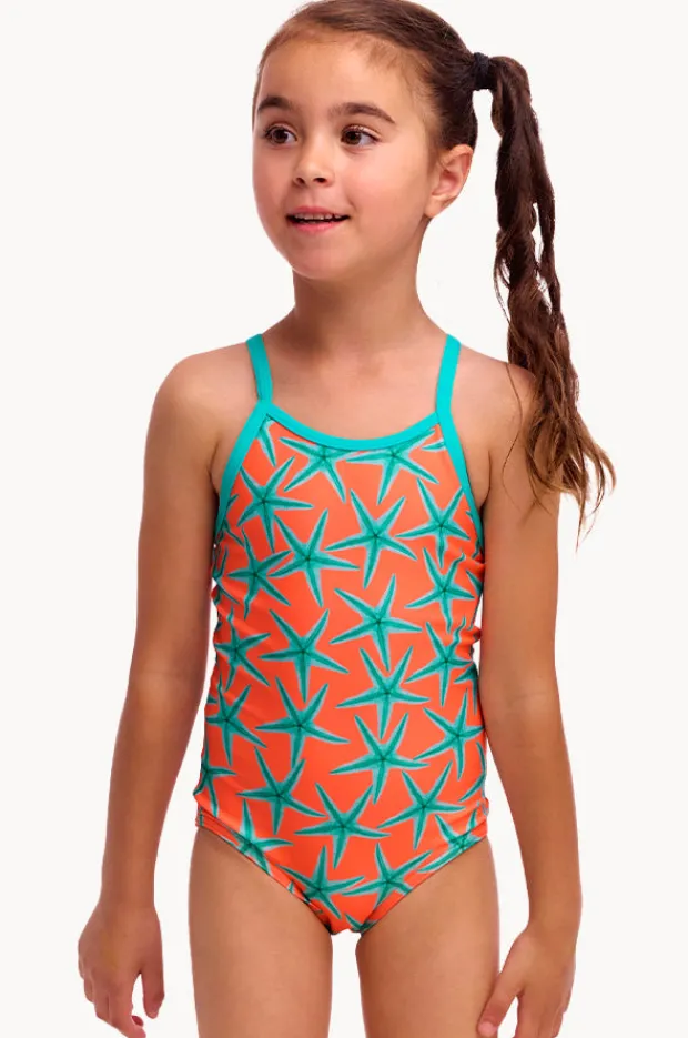 Funkita Girls Stars Below One Piece in Orange/Teal features single bind straps, V-shaped back, quick drying, chlorine resistant, available in sizes 4-7.