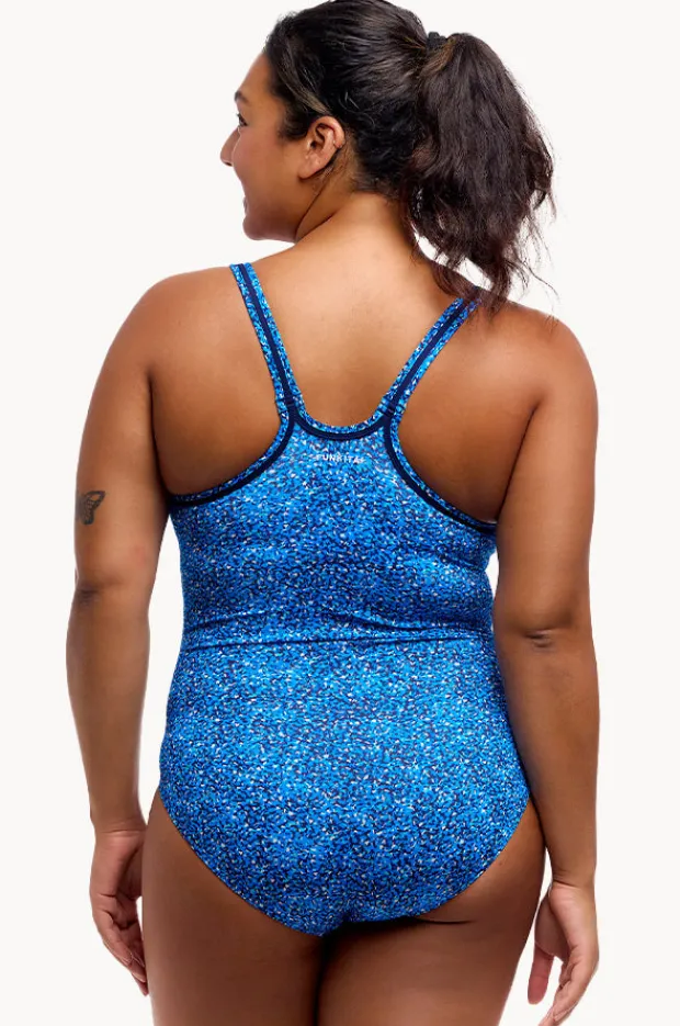 Funkita Pebble Beach Locked In Lucy One Piece in Blue features a shelf bra, powermesh, chlorine resistant thread, best suited to D-DD cup sizes.