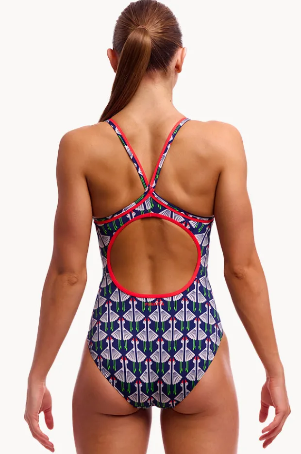 Funkita Sitting Duck Diamond Back One Piece in Navy/White features double bind shoulder straps, chlorine resistant fabric, and is best suited to A-C cup sizes.