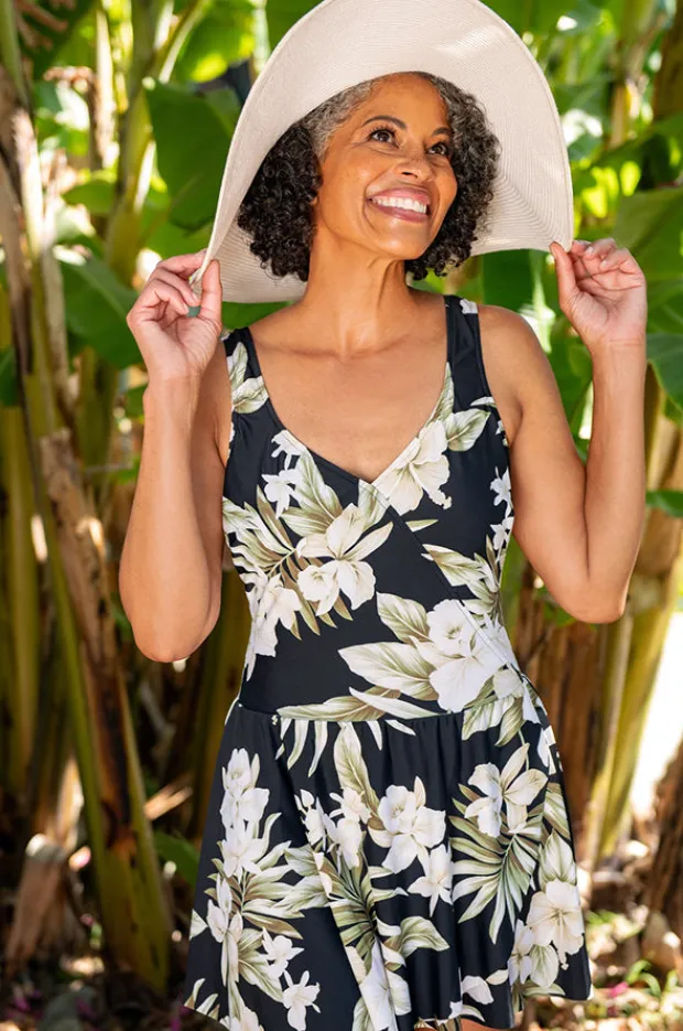 Maxine Island Greenery Swim Dress in Black features a V-shaped neckline, fixed shoulder straps, internal pant, skirted hem, and is best suited to B-D cup sizes.