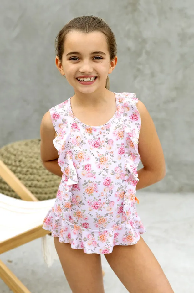 Salty Ink Girls Miss Rosie One Piece in Pink features a round neckline, adjustable cross back straps, frill detailing, and is available in sizes 4-7.