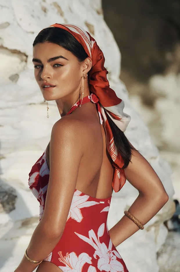 Sea Level Veridian Twist Front Halter One Piece in Ruby features an adjustable halter tie, soft cups, powermesh, ruching, and is best suited to A-D cup sizes.