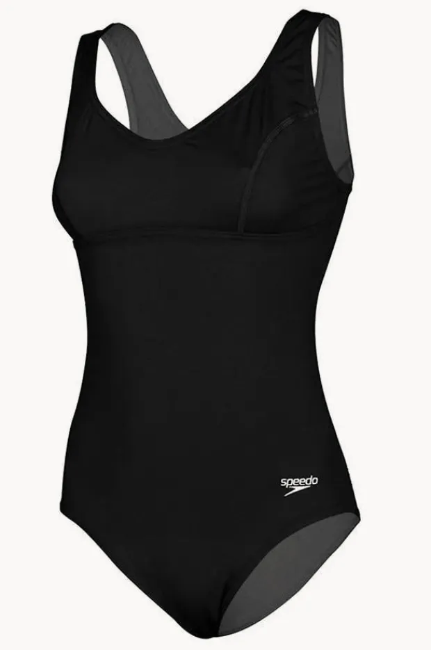 Speedo Endurance+ Contour Clipback One Piece in Black features a modest neckline, shelf bra, back clip, chlorine resistant thread, suited to B-D cup sizes.