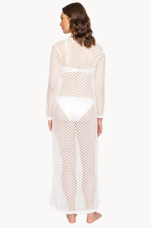 Koy Resort Zuma Cardigan in Natural features open front, centre front tie with tassel ends, full length, side splits and is made from a crochet fabrication.