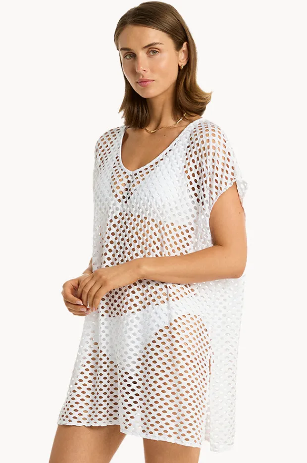 Sea Level Castaway Kaftan in White features a vee shaped neckline, short length, relaxed fit, sheer coverage, and is available in One Size.