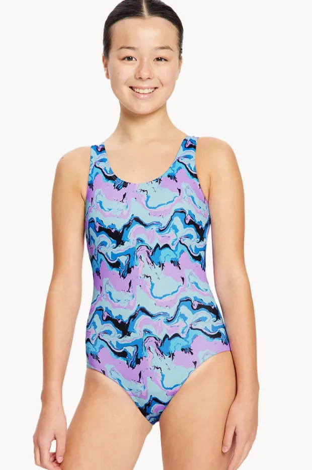 Modibodi Girls Marble Performance Racerback One Piece in Blue offers super absorbency period protection, shelf bra, removable cups, is available in sizes 10-18.
