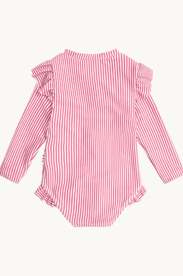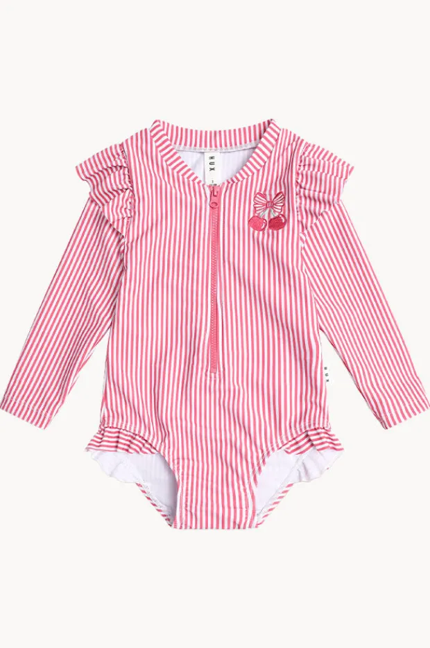 Huxbaby Girls Cherry Pie Stripe Frill Sunsuit in Cherry offers a front zip, long sleeves, sun protection, frill detail, sustainable, is available in sizes 4-7.
