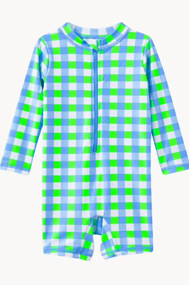 Milky Baby Boys Check Sunsuit in Green/Blue offers a round neckline, long sleeves, sun protection rating, front zipper, zip guard, is available in sizes 0-2.