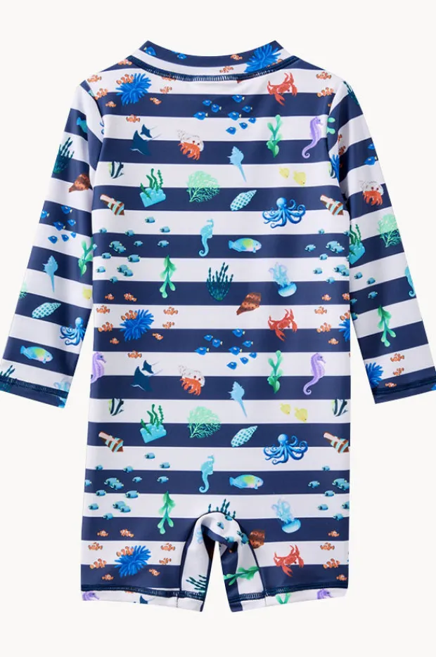 Milky Baby Boys Marine Sunsuit in Navy/White offers a round neckline, long sleeves, sun protection rating, front zipper, zip guard, is available in sizes 1-2.