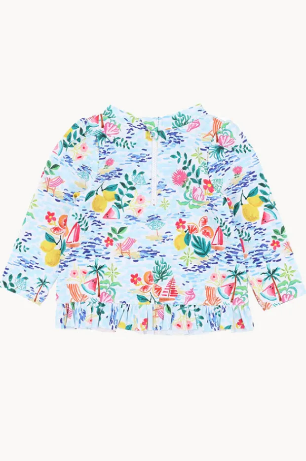 Minihaha Girls Addison Suntop in Blue/Multi features a round neckline, long sleeves, back zip, sun protection, sustainable, and is available in sizes 1-2.