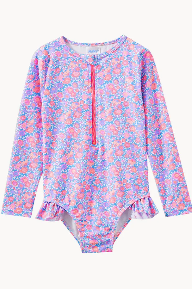 Milky Girls Pretty Posy Sunsuit in Pink/Blue features long sleeves, sun protection rating, front zipper, zip guard, and is available in sizes 2-7.