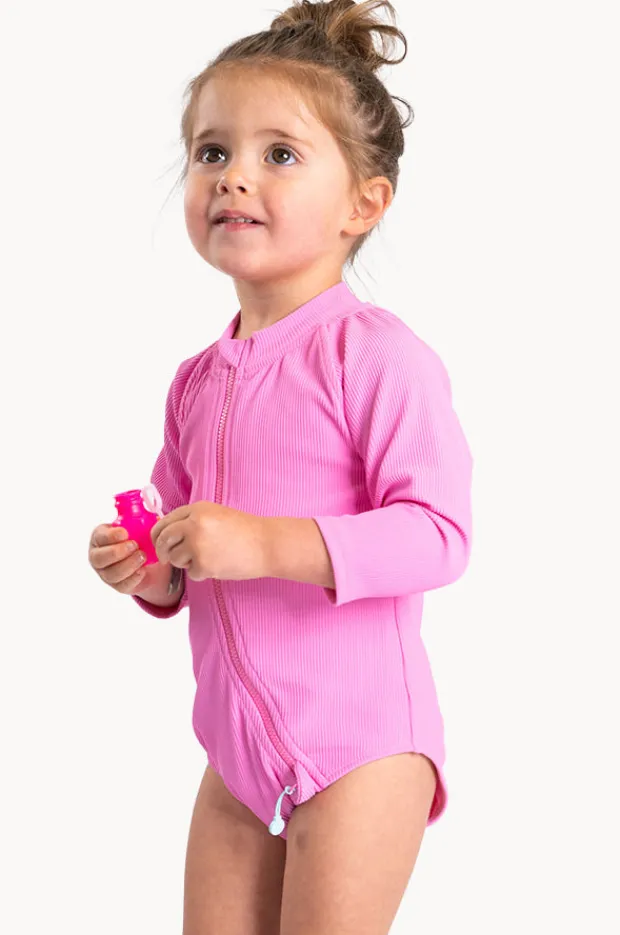 Tini Togs Baby Girls Long Sleeve Zip Sunsuit in Marshmellow features long sleeves, sun protection rating, full length zipper, and is available in sizes 0-3.