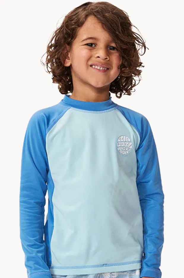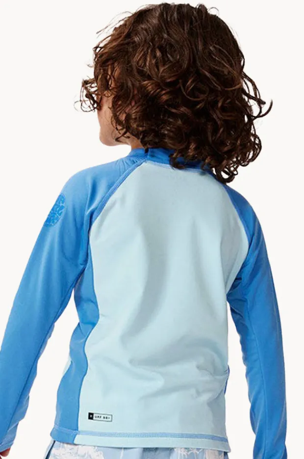 Rip Curl Boys Icons Brushed Long Sleeve Suntop in Blue offers a round neckline, contrast panelling, long sleeves, sun protection, and is available in sizes 1-8.