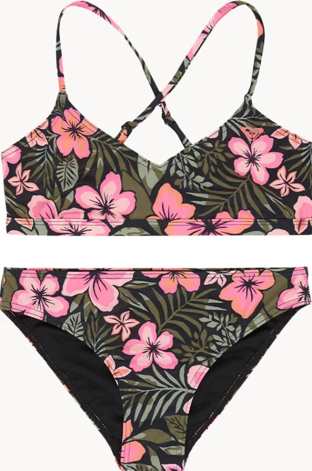 Roxy Girls Active Floral 3 Piece Set in Black/Pink features a rash top, bralette bikini top, coordinating hipster pant, and is available in sizes 8-16.