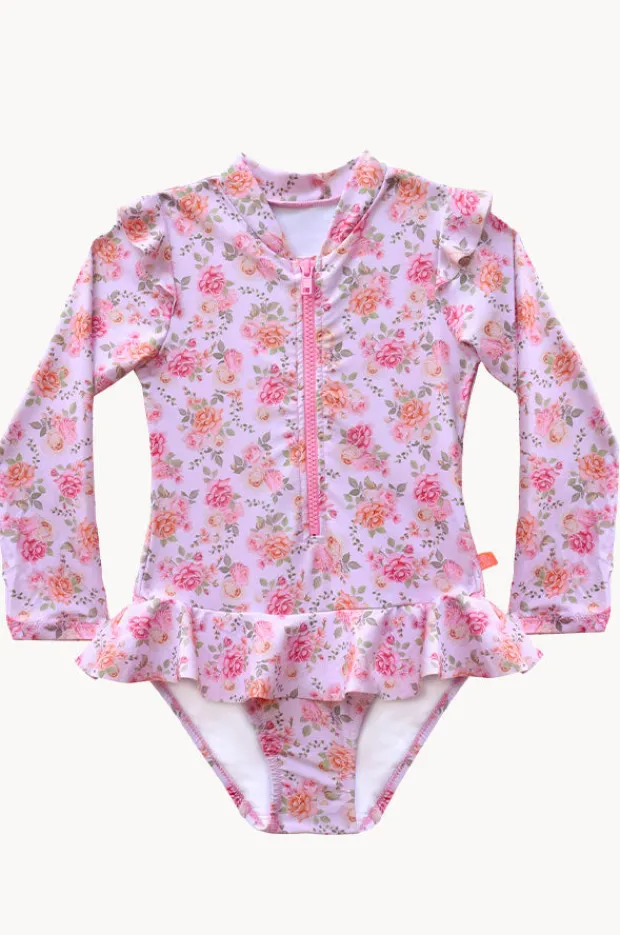 Salty Ink Girls Miss Rosie Sunsuit in Pink features a front zipper, UPF sun protection rating, long sleeves, frill detail, and is available in sizes 4-7.