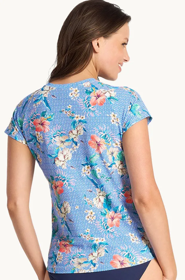 Sunseeker Chilio Short Sleeve Suntop in Blue offers a soft neck band, front zip, short sleeves, sun protection, mastectomy pockets, is available in sizes 8-16.