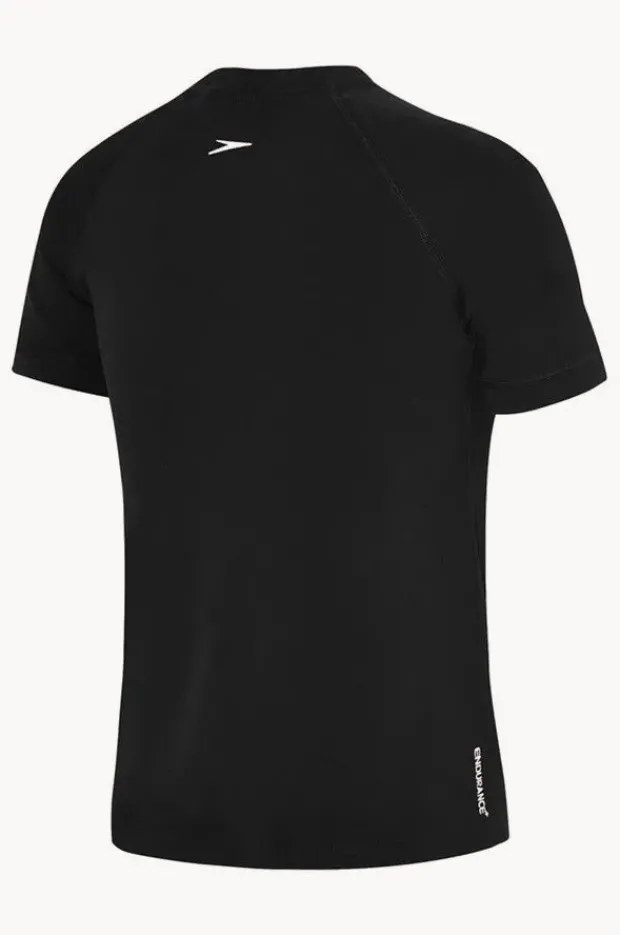 Speedo Boys Logo Suntop in Black features a chlorine resistant fabric, UPF 50+ sun protection rating, short sleeves and Speedo branding detail on centre front.