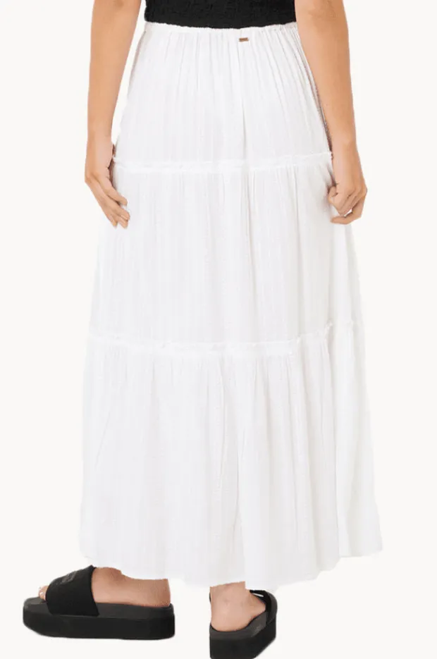 Rip Curl Haze Tiered Maxi Skirt in White features an elasticated waistband, drawcord, maxi length, tiered design, relaxed fit, and is available in sizes XS-XL.