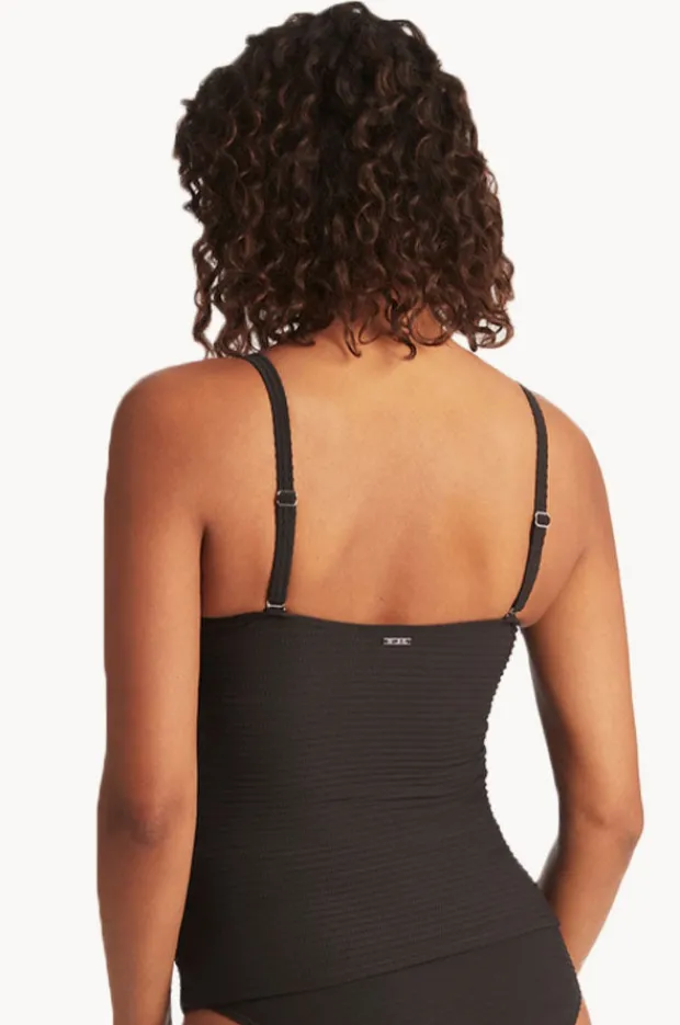 Sea Level Spinnaker Cross Front Tankini Separate in Black features adjustable and convertible straps, soft cups, powermesh, and is designed for A-D cup sizes.