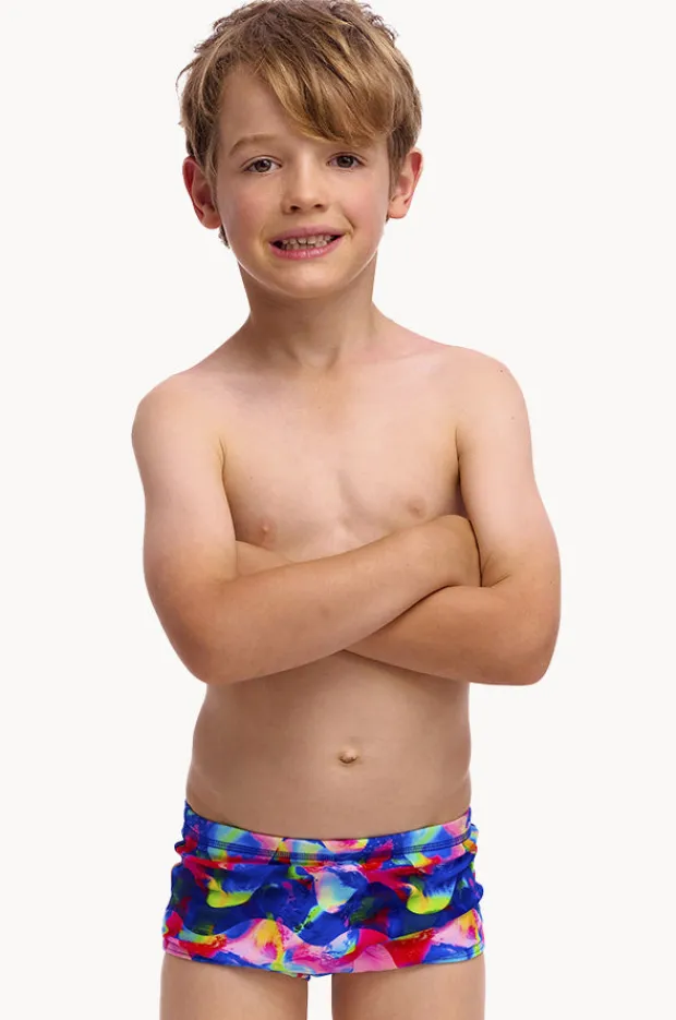 Funky Trunks Boys Wet Wave Trunk in Multi features an elasticated waistband, drawcord, flatlock stitching, chlorine resistant, and is available in sizes 3-7.