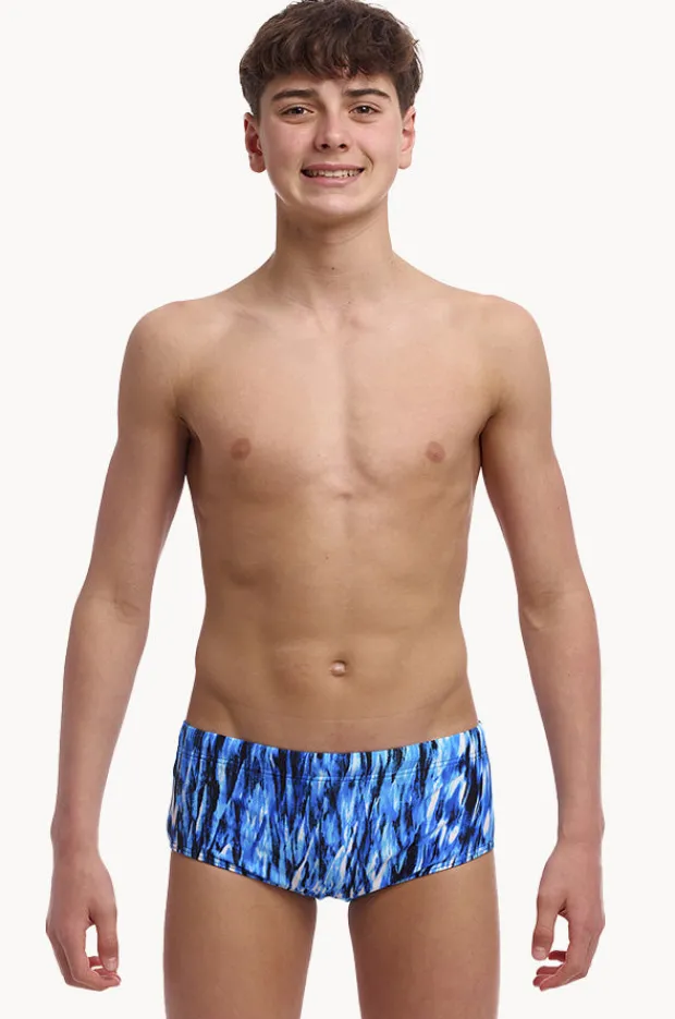 Funky Trunks Boys Wing Streak Trunk in Blue features an elasticated waistband, drawcord, front lined panel for modesty, and is chlorine resistant.